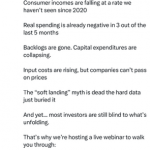 ✅ The claim of a “dead” soft landing narrative is backed by evidence of collapsing capital expenditures and rising input costs that companies cannot pass on, challenging the Federal Reserve’s historical soft landing successes (e.g., 1965, 1984), as post-5% inflation peaks (1970, 1974, 1980, 1990, 2008) consistently led to recessions, with 2022’s inflation exceeding 5% followed by two quarters of negative GDP growth.