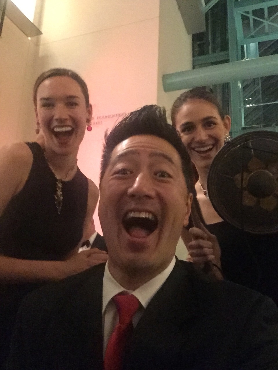 Kiran Dylan and Charlotte Bell hold what looks to be a massive token, but in reality it is just a gong